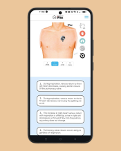 画面上に表示された前胸部上でチェストピースアイコンを移動させると、その部位の音が聴こえます。心音と肺音はそれぞれON/OFF切替が可能であるほか、脈をとりながら心音を聴く機能もあります。