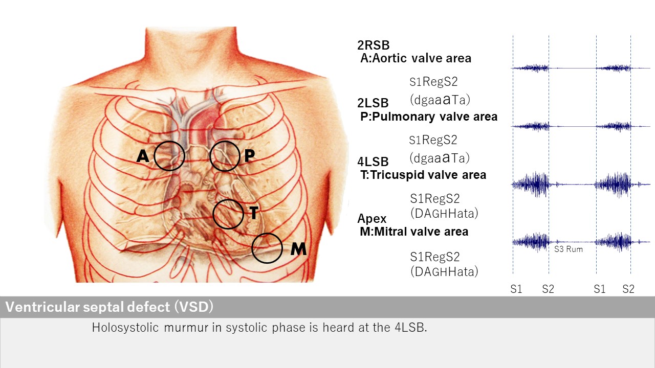 11月23日は、心室中隔欠損症(VSD)に特徴的な「粗く高調な全収縮期雑音」を聴き分けるクイズです。胸骨左縁で強く聴かれ、スリルを触知します。