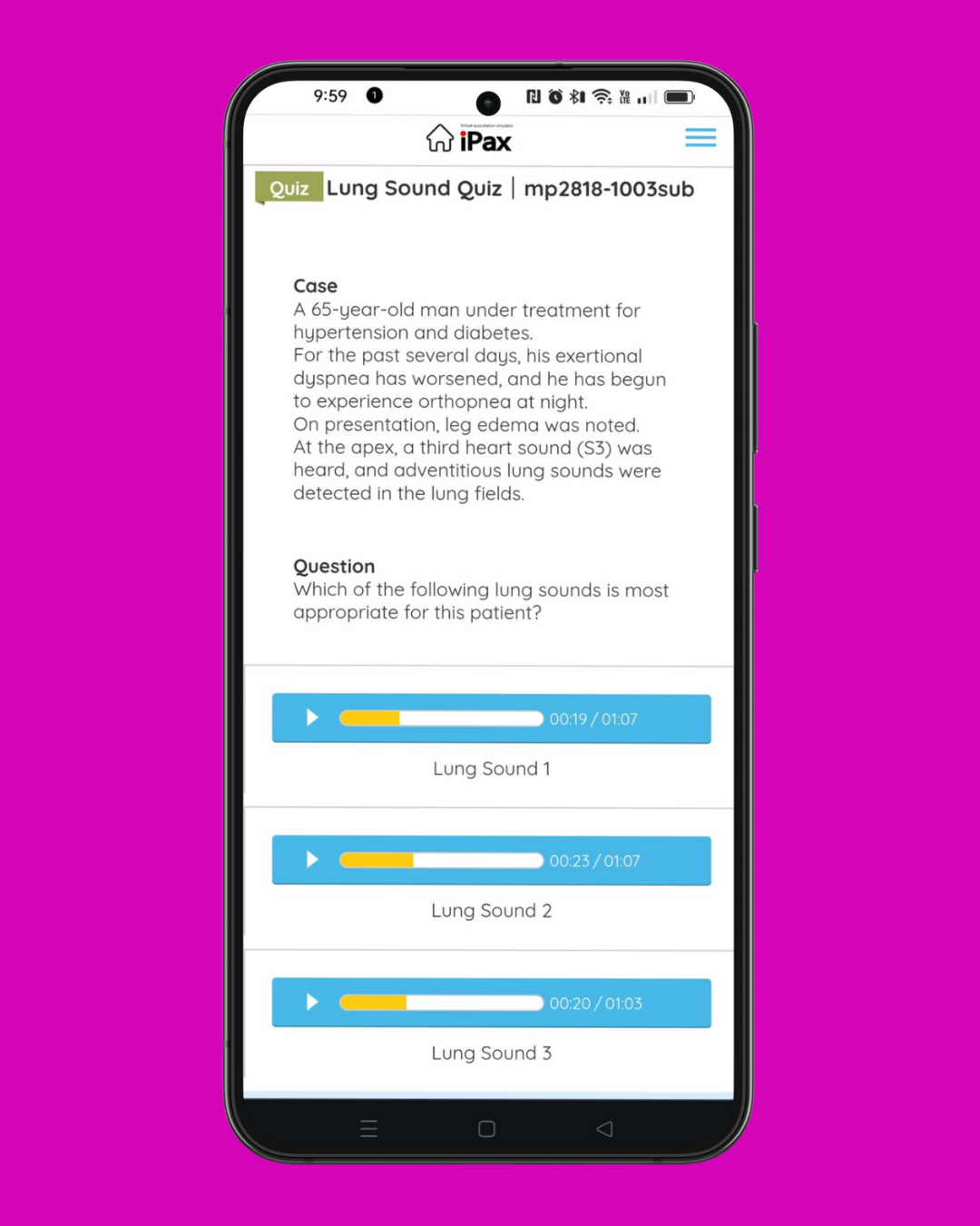 On October 3, we will study lung sounds in a case with orthopnea and leg edema. A quiz will be given in which you must choose the lung sound of this case from three options.