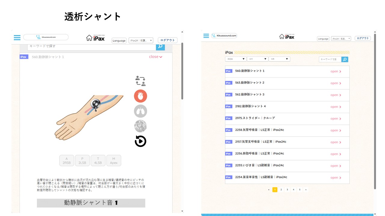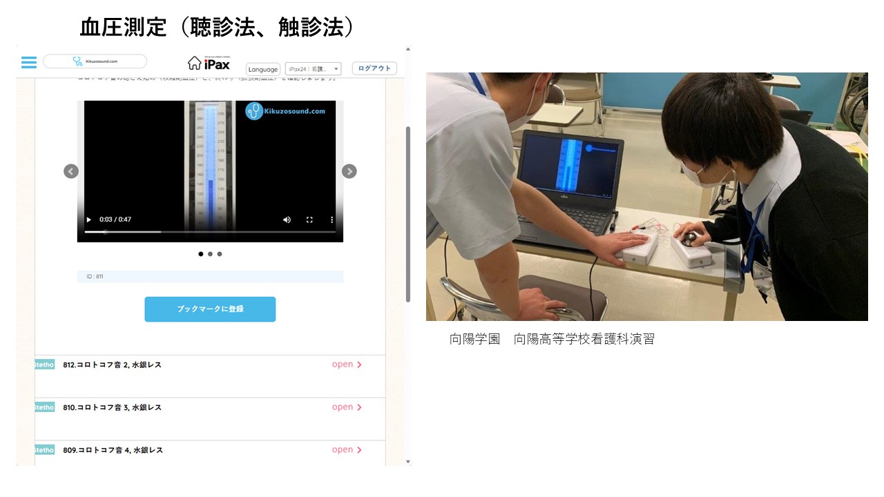 血圧測定は、聴診法(コロトコフ音)と触診法が練習でき、透析シャントのコンテンツも用意しています。