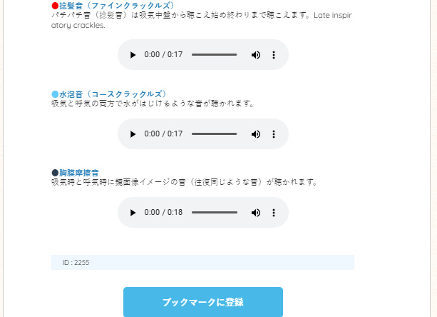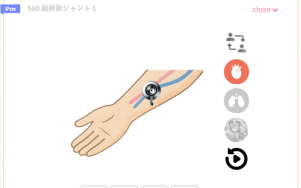 心音肺音の聴診だけでなく、血圧測定(聴診法、触診法)や透析動静脈シャント(聴診、スリル触診)も学習することができます。
